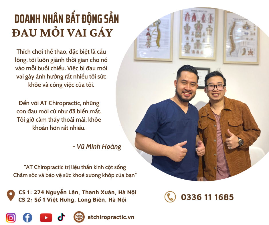 Anh Vũ Minh Hoàng là một nhà kinh doanh trong ngành bất động sản, trước đây anh luôn bị những cơn đau mỏi vai gáy hành hạ, anh chia sẻ: “Thích chơi thể thao, đặc biệt là cầu lông, tôi luôn dành thời gian cho nó vào mỗi buổi chiều. Việc bị đau mỏi vai gáy ảnh hưởng rất nhiều tới sức khỏe và công việc của tôi. Đến với AT Chiropractic, những cơn đau mỏi cứ như đã biến mất. Tôi giờ cảm thấy thoải mái, khỏe khoắn hơn rất nhiều.”