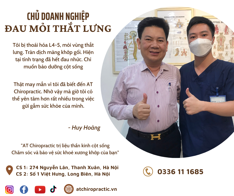 Bác Huy Hoàng, 55 tuổi, chủ doanh nghiệp lớn, quản lý và chăm lo cho sức khỏe hàng trăm nghìn nhân viên nhưng không làm chủ được được sức khỏe của mình. Bác ghé AT Chiropractic với mong muốn bảo dưỡng cột sống. Bác chia sẻ: “ Công việc của tôi khá vất vả. Bệnh ập tới lúc nào cũng không hay biết. Tôi bị thoái hóa L4-5, đau mỏi vùng thắt lưng. Tràn dịch màng khớp gối. Hiện tại tình trạng đã cải thiện. Các cơn đau đã gần như không còn. Nhưng tôi vẫn muốn sức khỏe xương khớp của mình được bảo vệ tốt hơn.” Trước đây, bác Hoàng cũng tìm kiếm rất nhiều những cơ sở uy tín để thăm khám và điều trị nhưng đều không có kết quả như mong đợi.