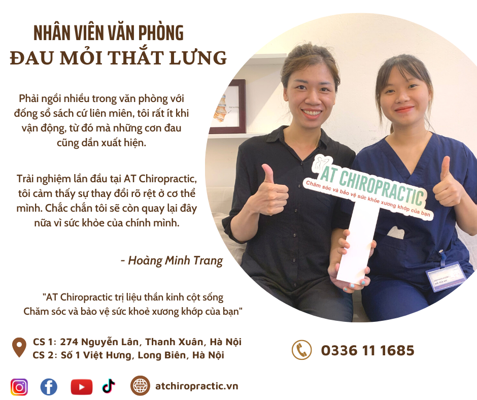 Để khắc phục tình trạng đó, chị đã áp dụng các phương pháp ăn uống, thuốc bóp,...nhưng vẫn không hiệu quả. Nhưng sau đó, thông qua mạng xã hội chị biết đến AT Chiropractic. Ở đây chị được các chuyên gia thăm khám tận tình và điều trị kịp thời. Chị đã được khắc phục tình trạng đau mỏi thắt lưng, hiện tại sau khi trải qua một quá trình điều trị, tình trạng của chị đã có chuyển biến tích cực. Đêm có thể ngủ ngon hơn, đi lại dễ dàng hơn, chị chia sẻ: “Lần đầu trải nghiệm AT Chiropractic, tôi cảm thấy sự thay đổi rõ rệt ở cơ thể mình. Chắc chắn tôi sẽ còn quay lại đây nữa vì sức khỏe của chính mình.”