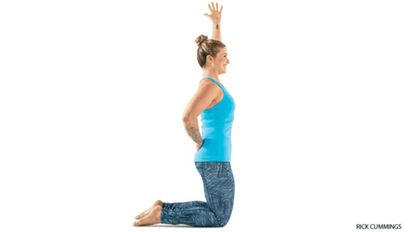 Bước 3: Hít vào, từ từ xoay đầu về chính giữa rồi nhẹ nhàng nâng người thẳng lên ở tư thế quỳ trên gối. Đến khi đầu và lưng cùng nằm trên một đường thẳng thì thở ra kết thúc bài.