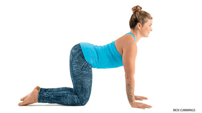 Bước 2: Hít vào, ưỡn ngực lên, phần lưng uốn cong hướng về phía sàn sao cho thấp hơn mông, đồng thời hai cánh tay hơi kéo nhẹ về phía sau. Giữ tư thế này trong 10 nhịp thở.