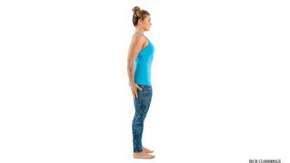 Bước 1: Đứng thẳng người, hai chân giang rộng khoảng cách 1 bàn chân, đặt hai bàn tay lên mông, hít vào căng bụng lên.